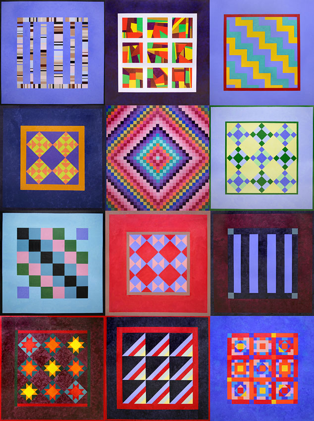Quilt designs created by staff members at Mercy Hospital in Iowa City Iowa are stenciled onto hospital, stairwell walls as a spot of brightness where no artifacts can be attached. Amish quilt designs were the inspiration as Mercy IC is home to a nearby Amish community and recipient of an Amish Quilt Collection donated by Alan and Nina Weinstein.